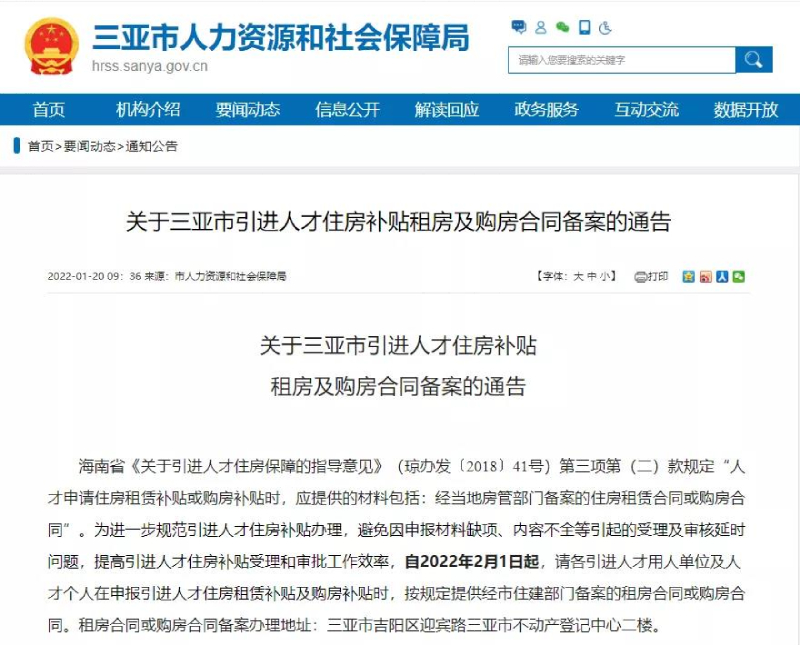 海南省《關(guān)于引進人才住房保障的指導(dǎo)意見》(瓊辦發(fā)〔2018〕41號)第三項第(二)款規(guī)定“人才申請住房租賃補貼或購房補貼時,應(yīng)提供的材料包括:經(jīng)當(dāng)?shù)胤抗懿块T備案的住房租賃合同或購房合同”。為進一步規(guī)范引進人才住房補貼辦理,避免因申報材料缺項、內(nèi)容不全等引起的受理及審核延時問題,提高引進人才住房補貼受理和審批工作效率,自2022年2月1日起,請各引進人才用人單位及人才個人在申報引進人才住房租賃補貼及購房補貼時,按規(guī)定提供經(jīng)市住建部門備案的租房合同或購房合同。租房合同或購房合同備案辦理地址:三亞市吉陽區(qū)迎賓路三亞市不動產(chǎn)登記中心二樓。