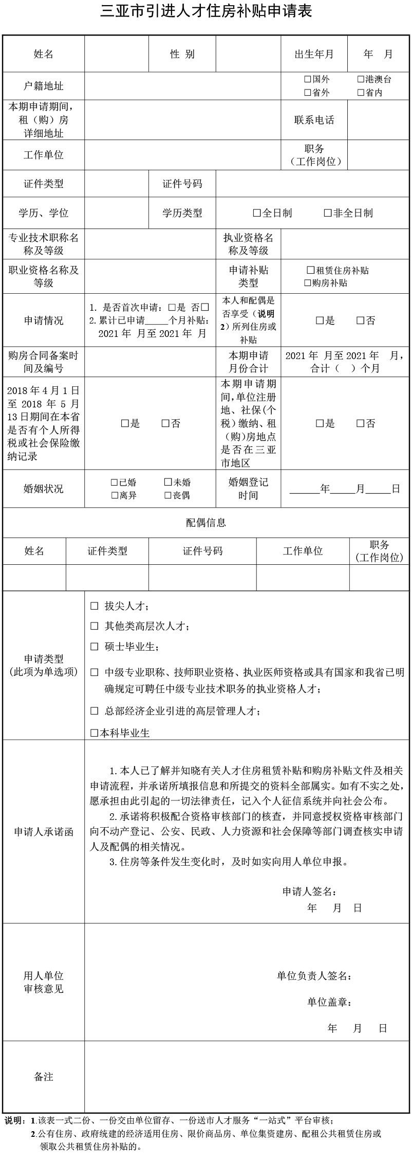 (一)三亞市人才住房租賃補貼和購房補貼申請表。