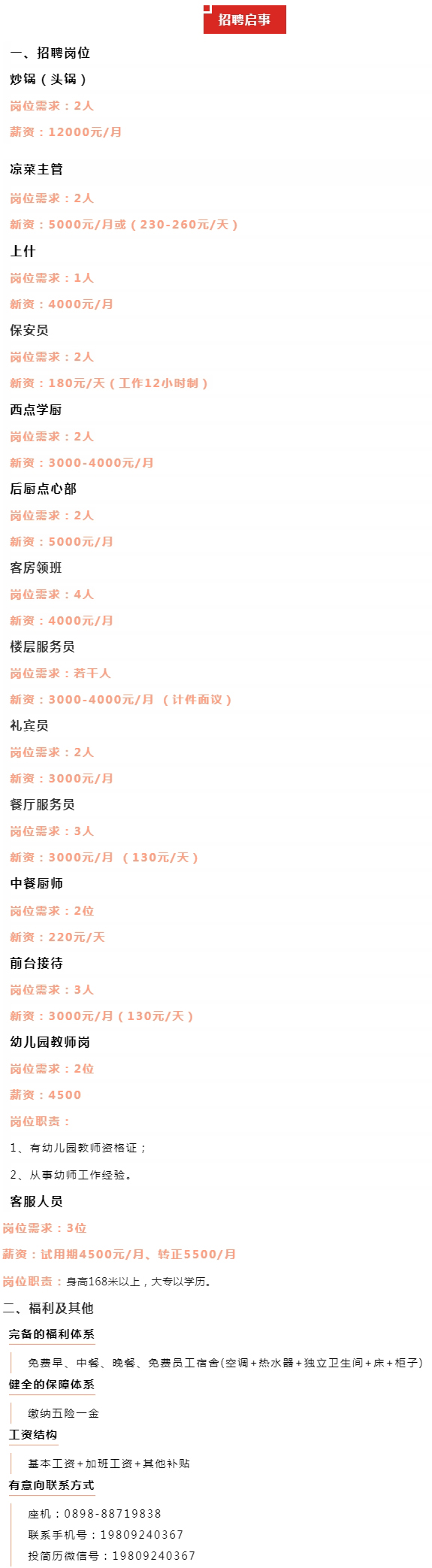 道格人力丨三亞國(guó)企酒店招聘若干崗位、公辦幼兒園招聘教師崗位