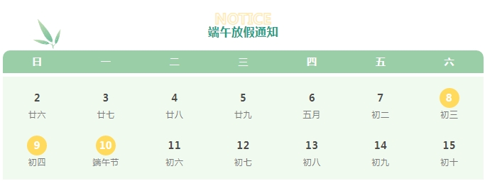 在2024年端午節(jié)來(lái)臨之際,根據(jù)《國(guó)務(wù)院辦公廳關(guān)于2024年部分節(jié)假日安排的通知》,結(jié)合公司實(shí)際工作情況, 假期為6月8日-10日端午節(jié)假期,6月10日(星期一)端午節(jié)當(dāng)天放假,與周末相連,共3天,無(wú)需調(diào)休。